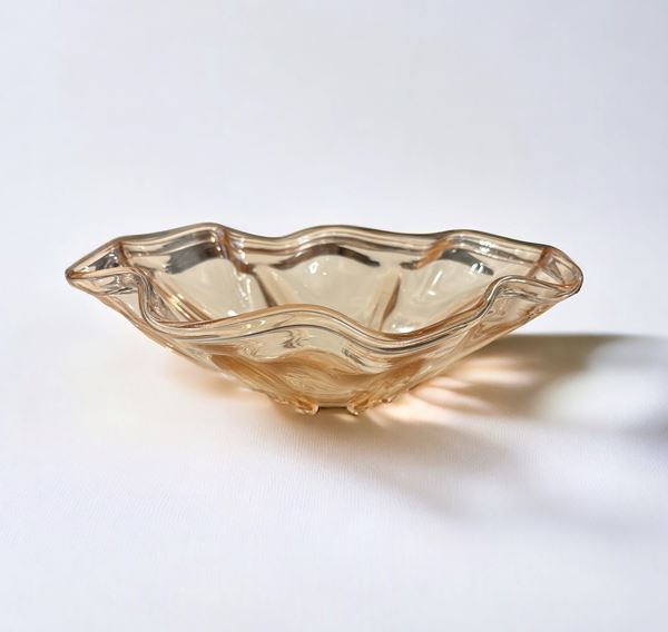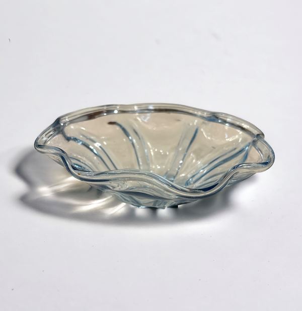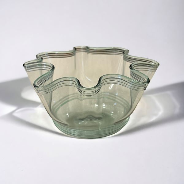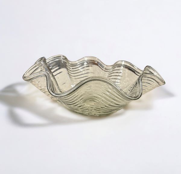 In vetro. A forma di ciotola con bordi ondulati. Dimensioni : 11 x diametro 31 cm; 11 x diametro 18 cm; 10 x diametro 28 cm; 7 x diametro 22 cm.
