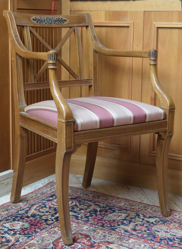 In legno di acero con applicazioni in bronzo e seduta tappezzata. Di linea Impero, moderna manifattura, anni 80.
