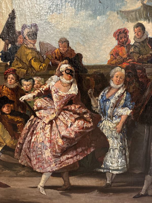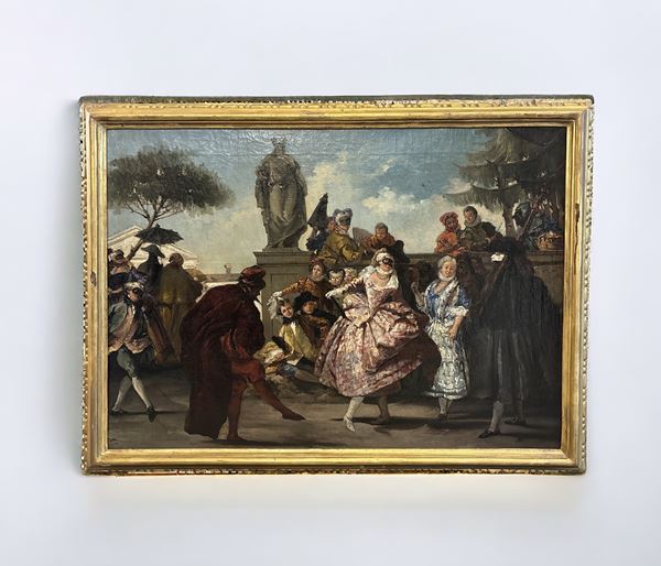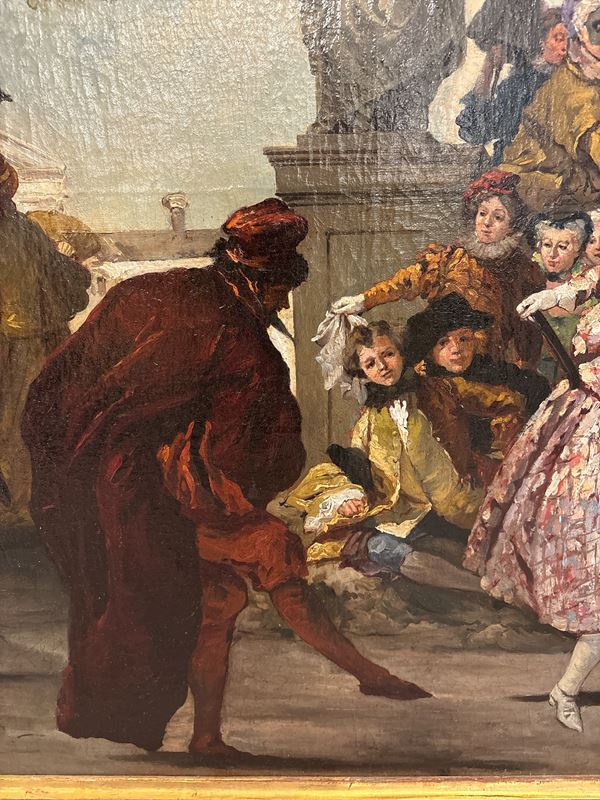 L'opera è una ripresa con varianti della composizione di Giandomenico Tiepolo conservata al Museu Nacional d'Art de Catalunya. Entro cornice.
