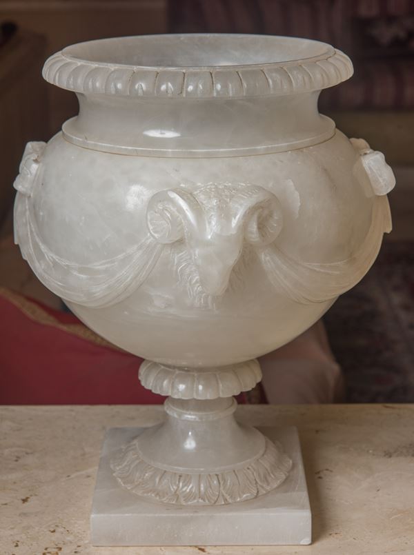 Con anse a forma di teste di ariete e ghirlanda con fiocco.