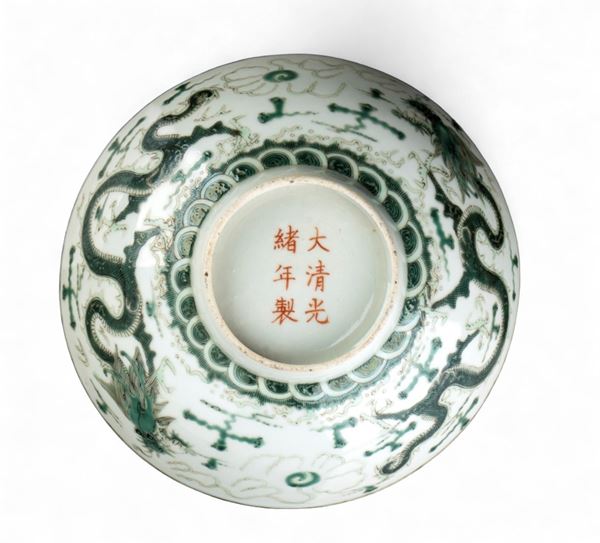 Con raffigurazioni a dragoni tra le nuvole sui toni del verde, reca marca e periodo Guanxu (1875-1912)