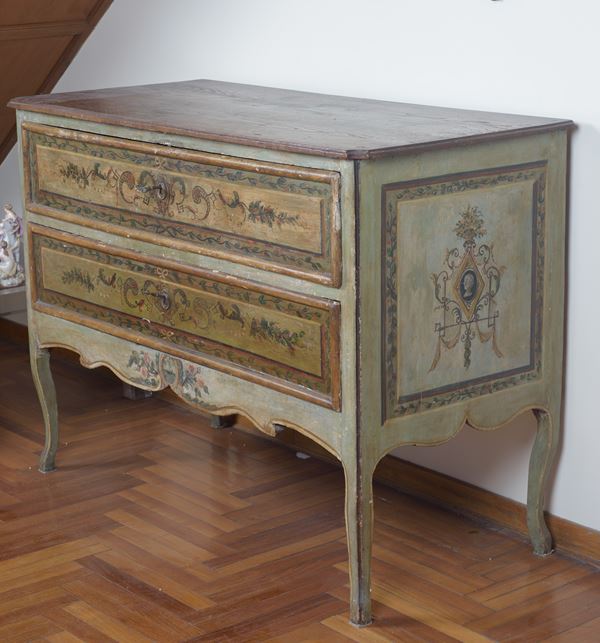 Commode a due cassetti in legno laccato, fine del XVIII - inizi del XIX secolo