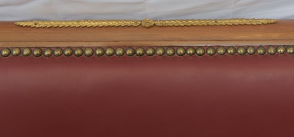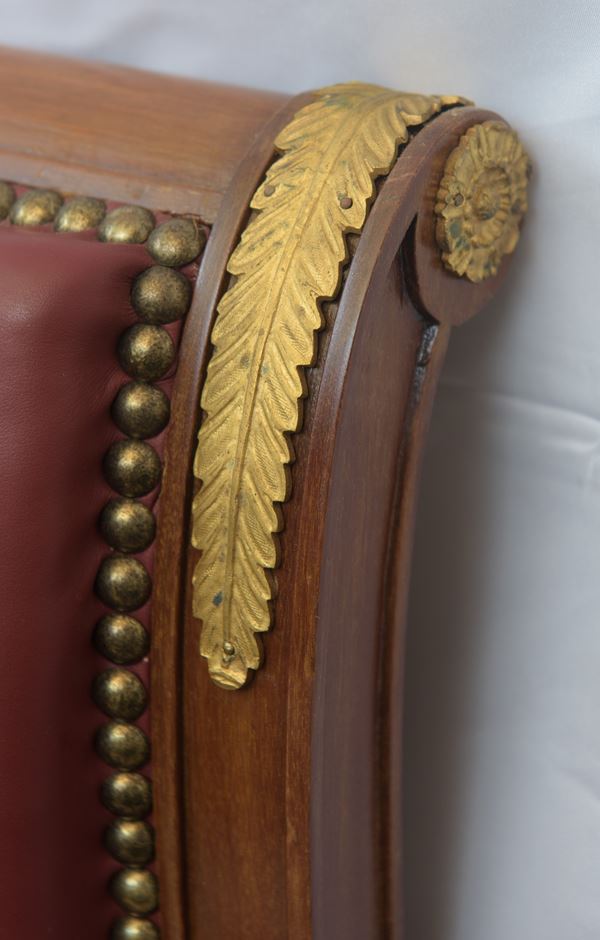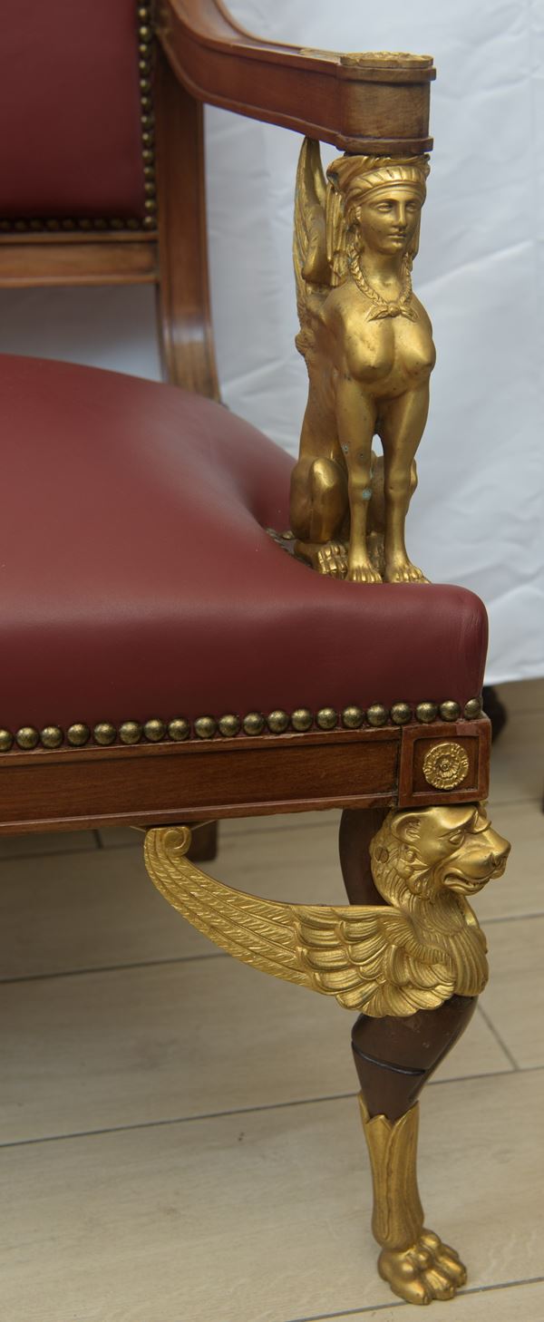 in legno di mogano di Cuba con importanti fregi in bronzo dorato recanti coppia di sfingi alate e leoni alati, di linea 'Ritorno d'Egitto'. Seduta, schienale e braccioli imbottiti con rivestimento in pelle.