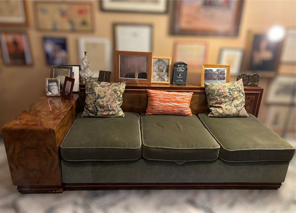 Divano letto impiallacciato in legno di noce, a tre posti. Dimensione armadietto laterale: H. 60 x 36). Smontaggio e trasporto a carico dell'acquirente da effettuarsi presso un'abitazione privata di Roma.