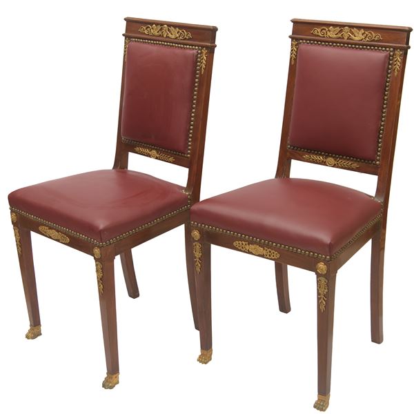 in legno di mogano, con seduta e schienale imbottiti con rivestimento in pelle. Applicazioni in bronzo dorato. Di linea Impero.