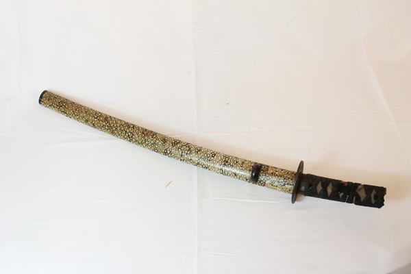impugnatura in pastinaca, fodero in osso intersiato e guardia in ferro traforato, firmata. Difetti e mancanze.