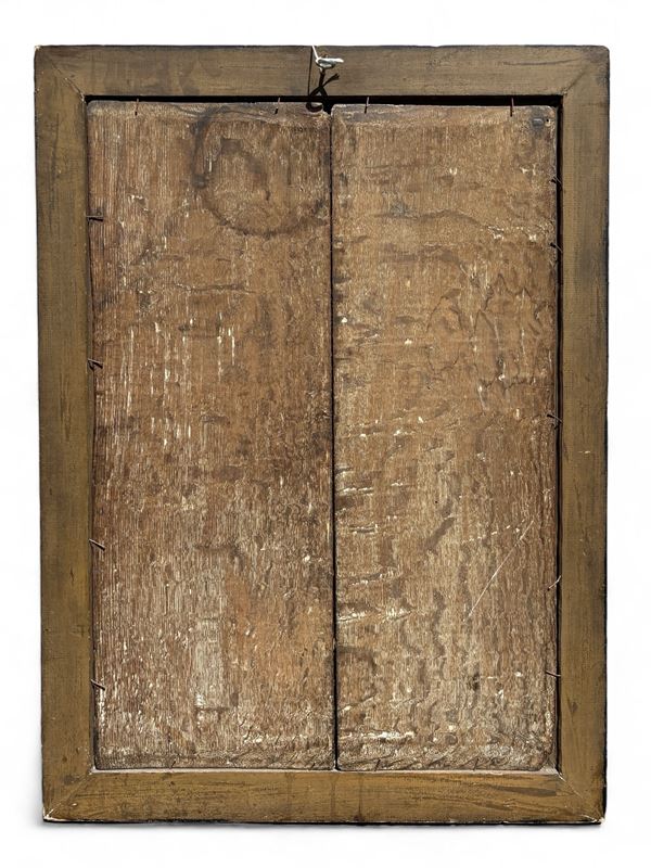 Ampia fenditura al centro della tavola. Entro cornice in legno laccato del XIX secolo.