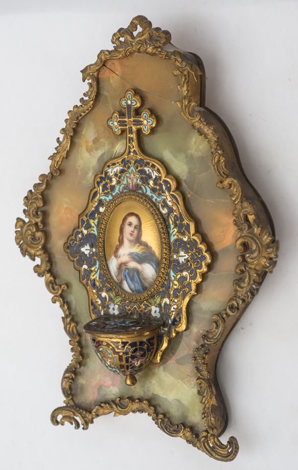 Base in diaspro agatato e bronzo del XIX secolo, acquasantiera in cloisonnè e ceramica dipinta del XX secolo. Difetti.