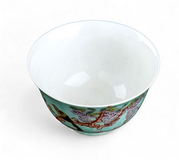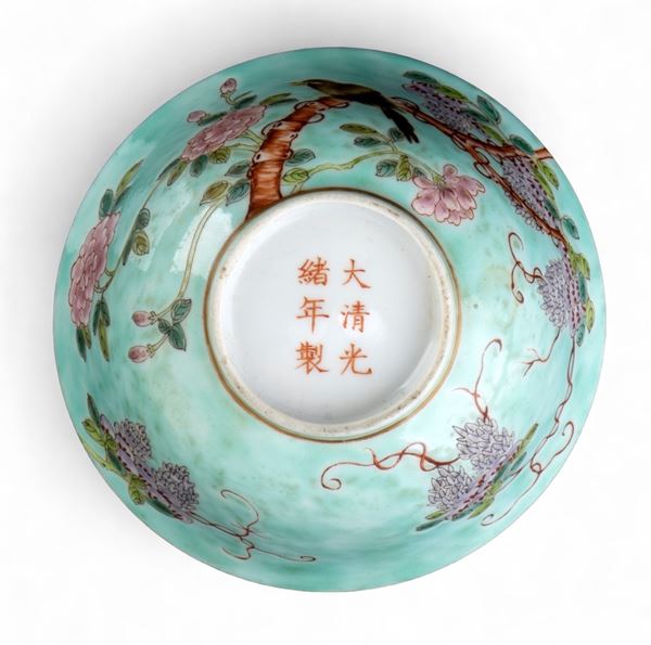 Con decoro a smalti policromi. Su fondo turchese. Marchio apocrifo Guangxu.