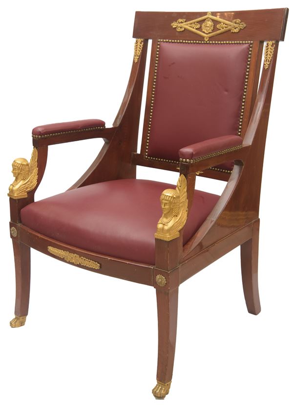 in legno di mogano di Cuba, con fregi in bronzo dorato, cariatidi alate. Di linea Ritorno d'Egitto. Seduta, schienale e braccioli imbottiti, rivestimento in pelle