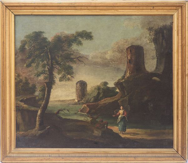 SCUOLA ITALIANA - Paesaggio fluviale con capriccio architettonico e personaggi, Prima metà XVIII secolo
