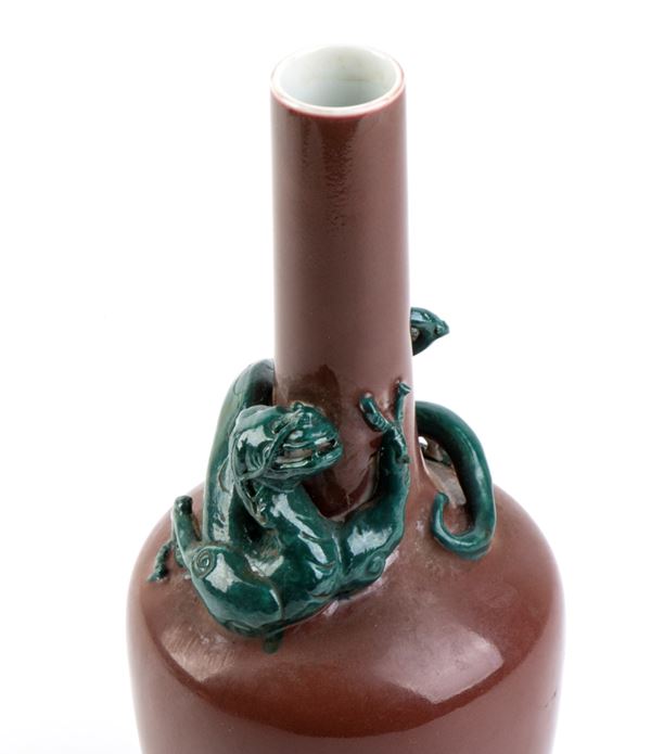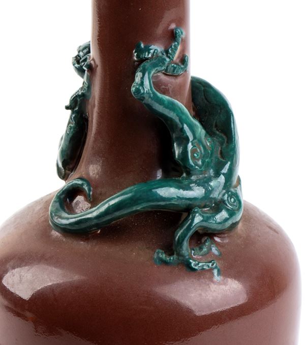 Smaltata rossa con decoro a rilievo raffigurante dragone. Marchiato alla base.