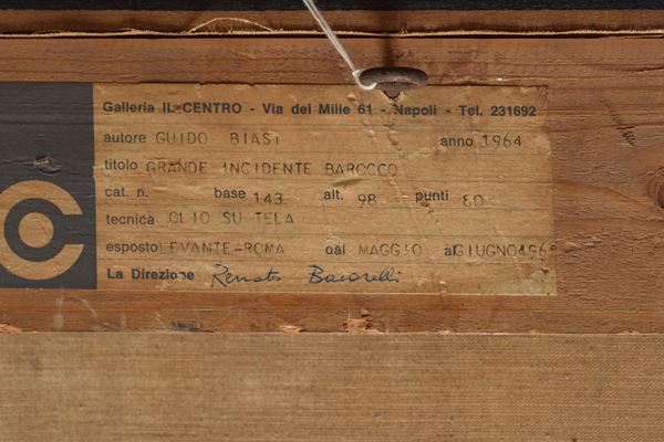 Firmato in basso a destra: G. Biasi P. '64. Firmato più volte al retro e sul telaio. Etichette di provenienza: Galleria "Il Centro" Napoli; Galleria del Levante - Roma. In cornice.