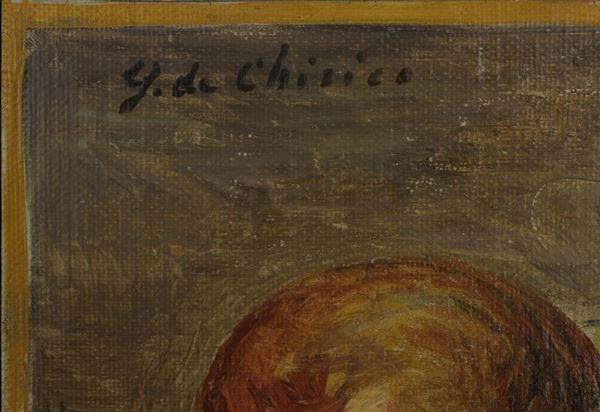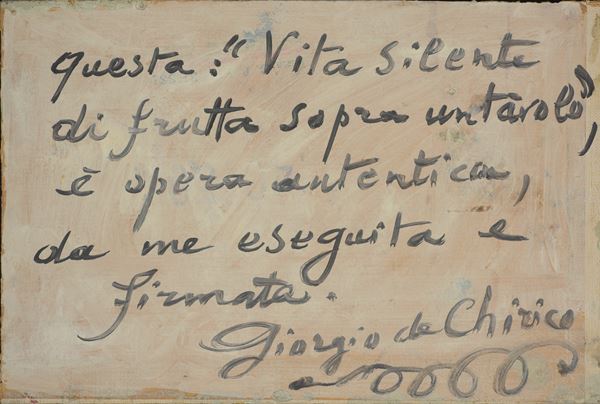 Firma in alto a sinistra G. de Chirico. Dichiarazione d'autenticità al verso: Questa: "Vita silente di frutta sopra un tavolo", è opera autentica, da me eseguita e firmata. Giorgio de Chirico. In cornice. Autentica su foto della Fondazione Giorgio e Isa de Chirico, Roma, 10 giugno 2024.
