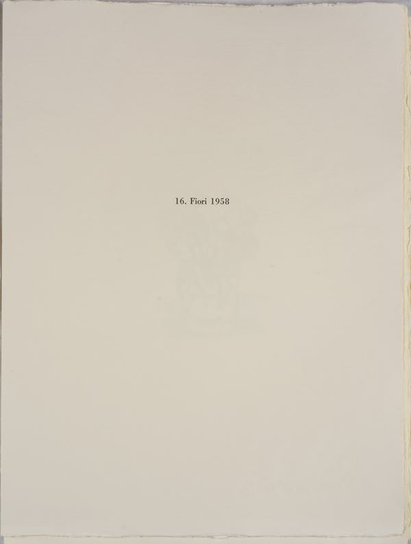 Tratta dall'edizione n. 13/120 (presente sul colophon). Firmato in lastra. L'opera è stampata in fotolitografia su carta di cotone fatta a mano molto spessa (con velina protettiva originale), progettata e prodotta appositamente per questa edizione dalla cartiera Miliani di Fabriano. Il foglio è raccolto in un'altra cartella di carta di cotone fatta a mano leggermente più sottile, recante la firma dell'artista "Morandi" in filigrana, realizzata appositamente dalla cartiera Enrico Magnani di Pescia.