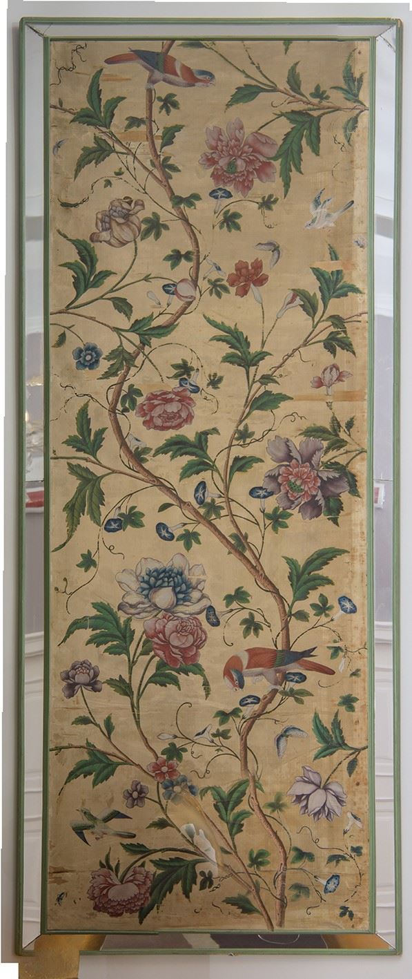 dipinti su seta, a decorazioni floreali e volatili. Entro cornice specchiata. Difetti.