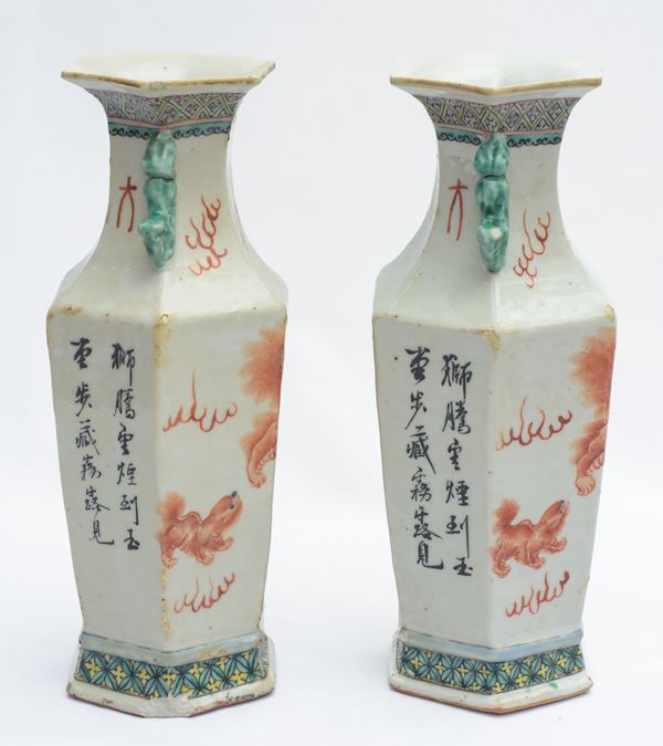 Di forma esagonale. Decori raffiguranti dragoni. Dinastia Qing. Marchio alla base. Difetti.