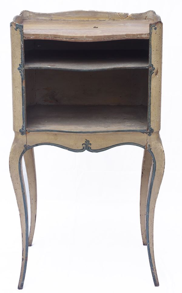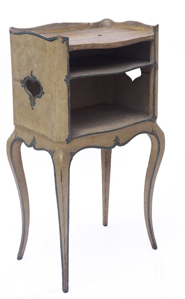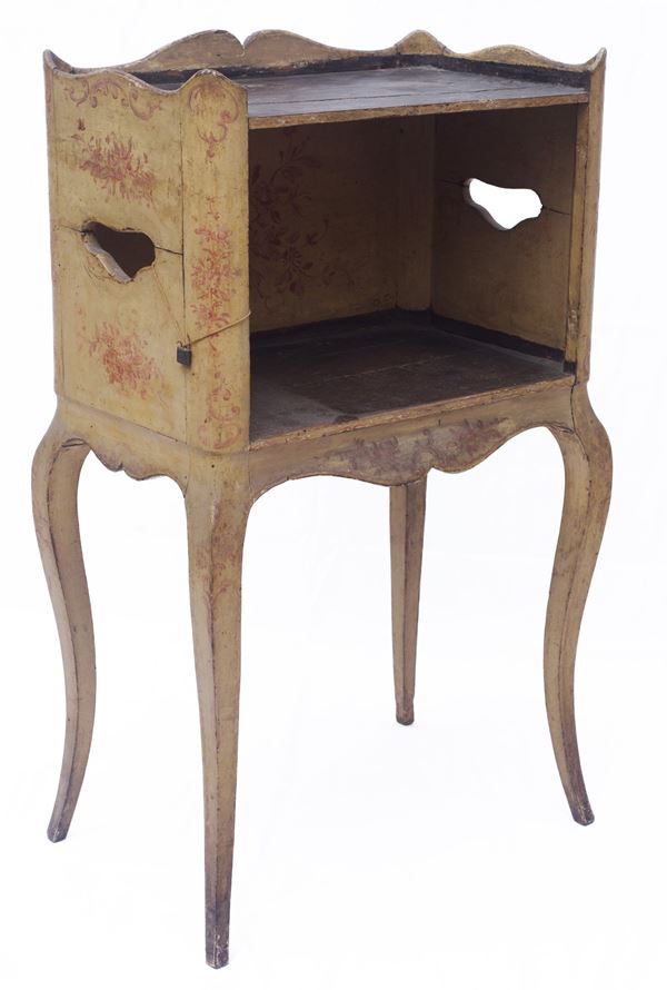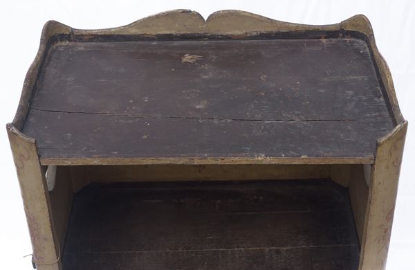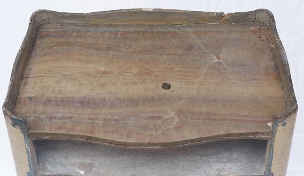 similari tra loro, in legno laccato, di cui uno decorato a motivi floreali a sfondo ocra. Piano superiore a finto marmo. Periodo Barocchetto Genovese. Restauri e mancanze.