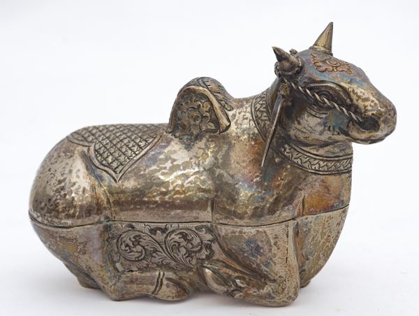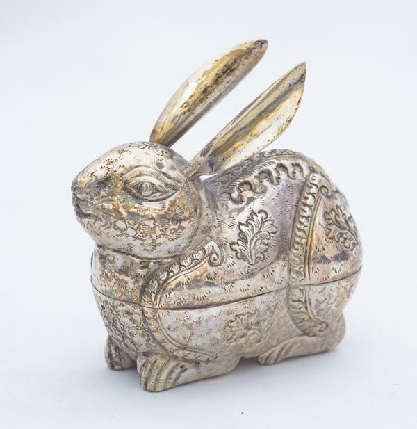 a forma di bovino e coniglio. In metallo argentato inciso e sbalzato.