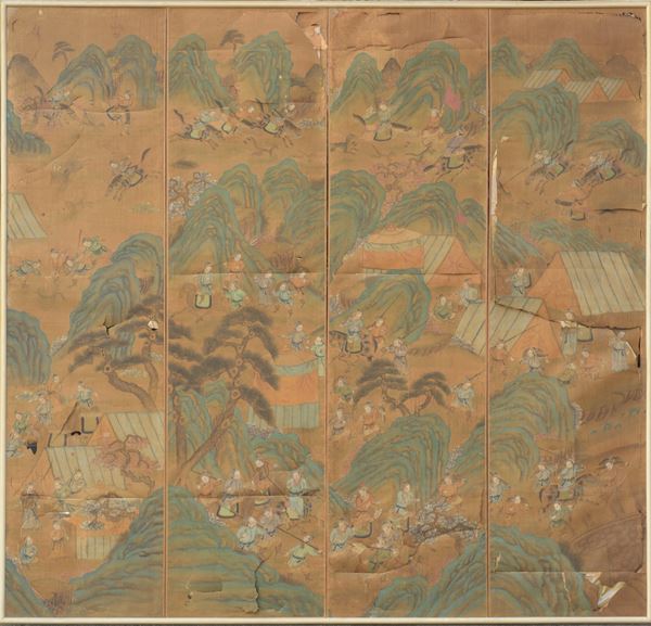 raffigurante scene di vita quotidiana, gravi difetti. In cornice. Provenienza: dalla collezione d'arte di un importante Hotel di Via Veneto - Roma.