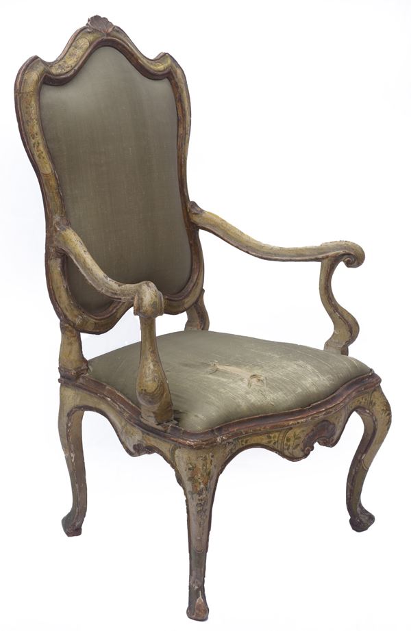 in legno laccato e decorato a motivi floreali, seduta e schienale imbottiti. Periodo del Barocchetto Veneziano. Restauri e mancanze.
