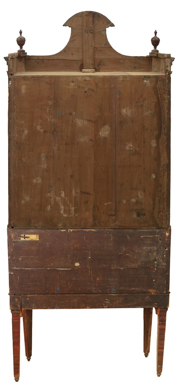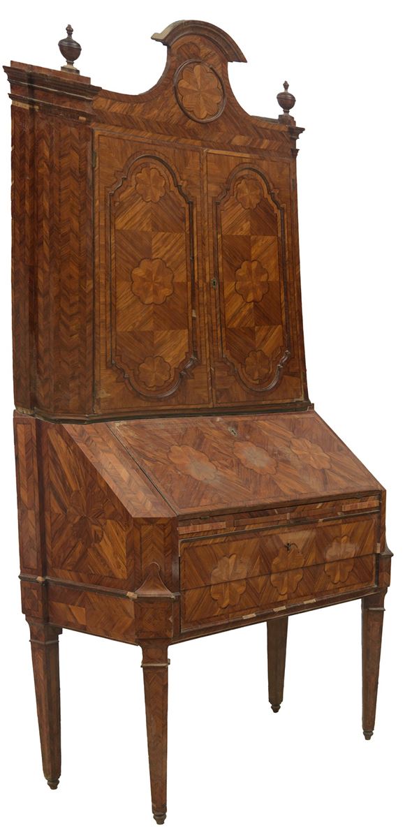 in ebano viola e ebano rosa. Ribalta e cassettiera interna nella parte inferiore, due ante superiori con castello interno e tre cassetti. Due pinnacoli e gambe tronco piramidali. Restauri e mancanze