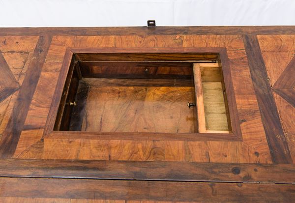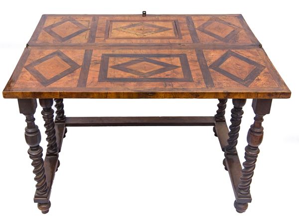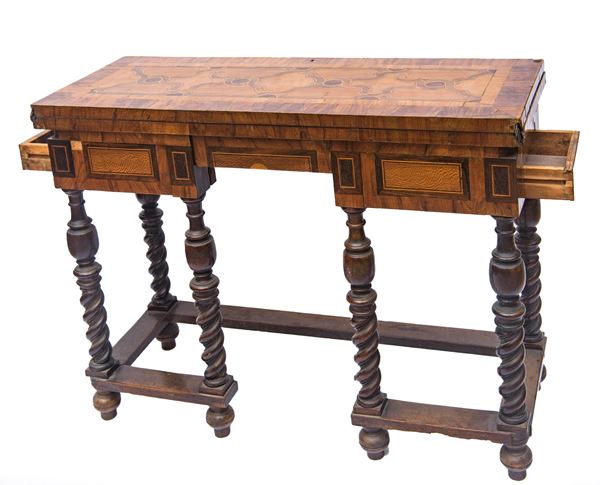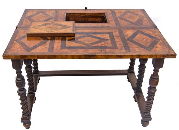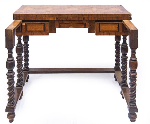 a sei piedi a tortiglione, con piano ribaltabile. In legno di noce, radica di noce e olivo. Due cassetti laterali e scomparti interni. Manifattura lombarda. Provenienza: dalla collezione d'arte di un importante Hotel di Via Veneto - Roma.