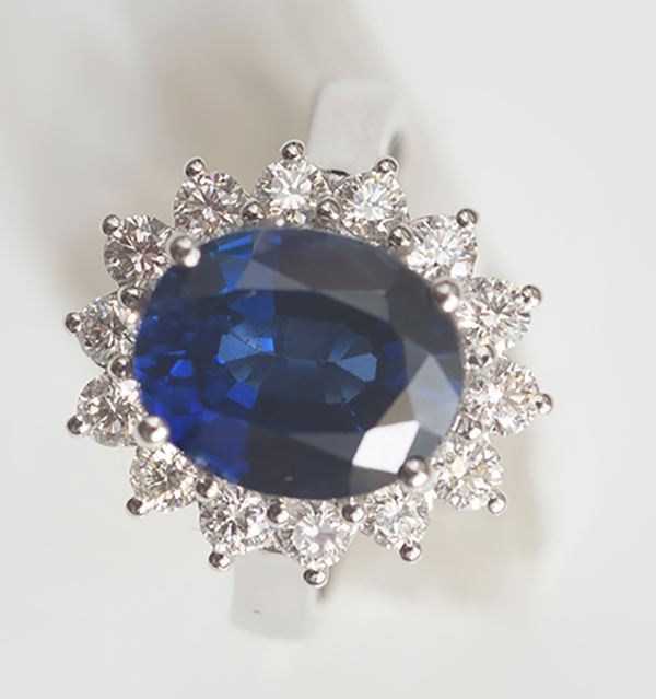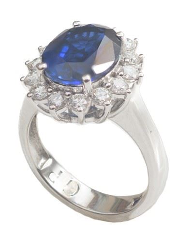 con zaffiro idrotermale di carati 5, più un carato di brillanti. Peso 8 grammi