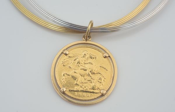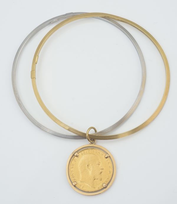 a due cerchi, pendaglio con moneta incassata, grammi complessivi 15