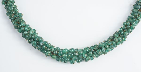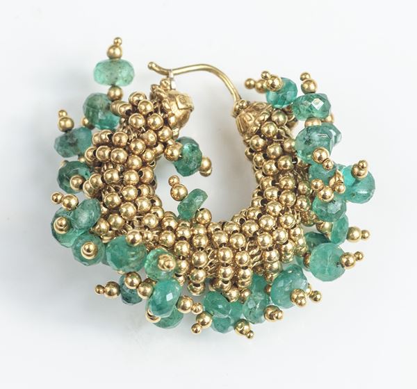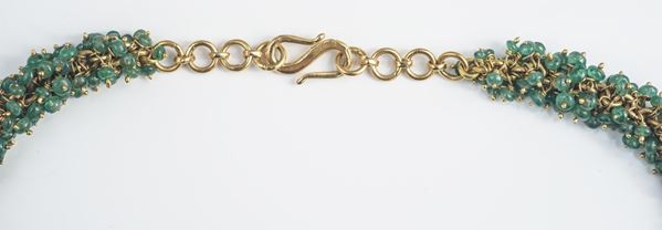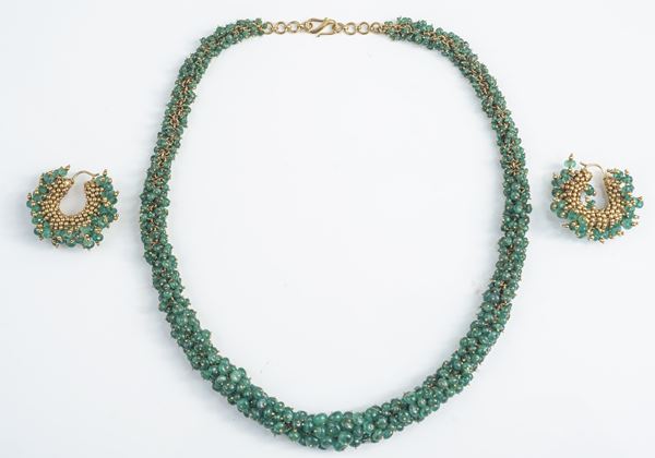 parure composta da collana e orecchini, in oro giallo 18kt con smeraldi naturali intrecciati con catena in oro.