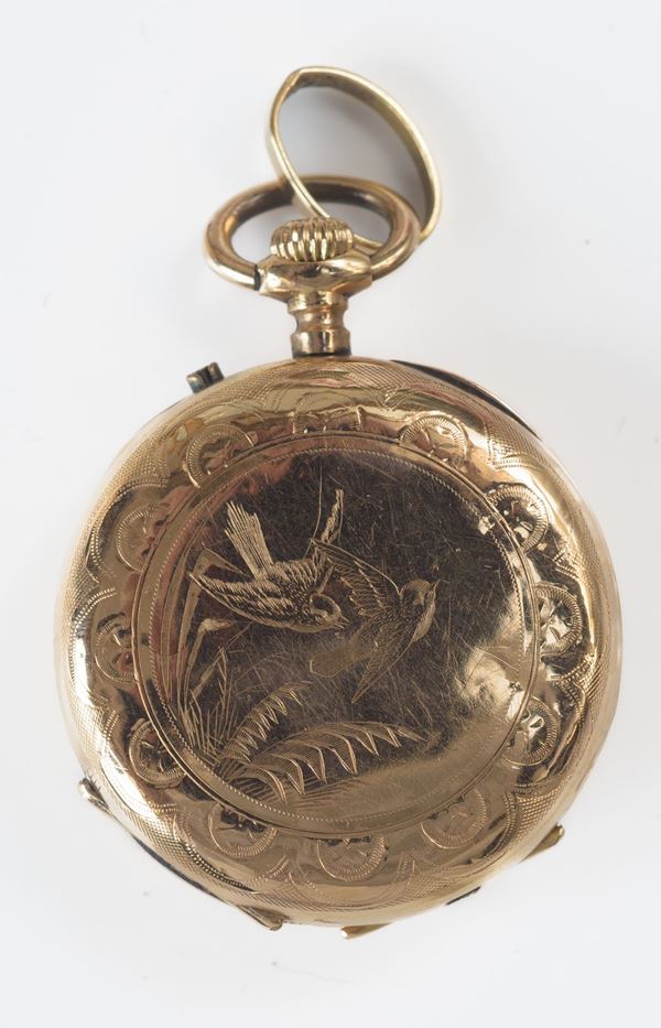 In oro 14 kt.  Cassa decorata con volatili, quadrante in smalto bianco, numeri arabi, lancette a pera.