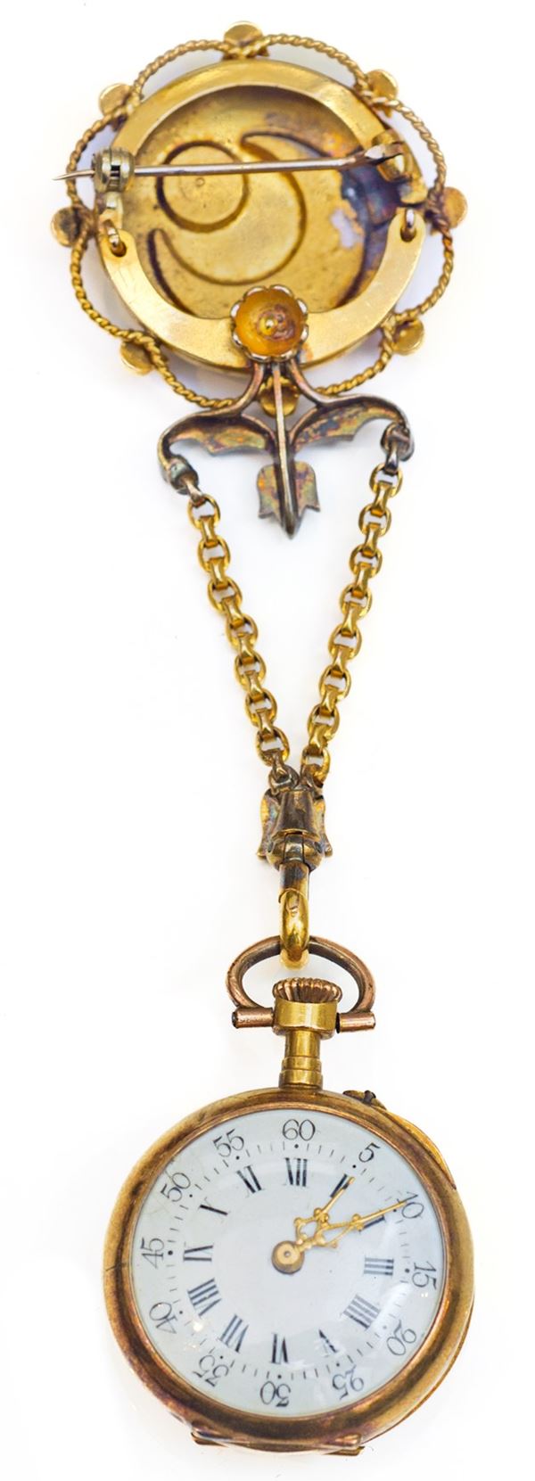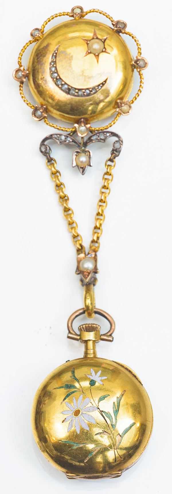 Orologio da tasca e spilla in oro 18 kt, inizi del XX secolo