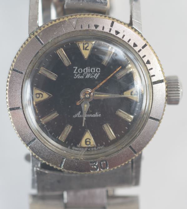 Automatico in acciaio. Diametro senza corona 24 mm. Bracciale originale in acciaio inossidabile con logo Zodiac (rottura).