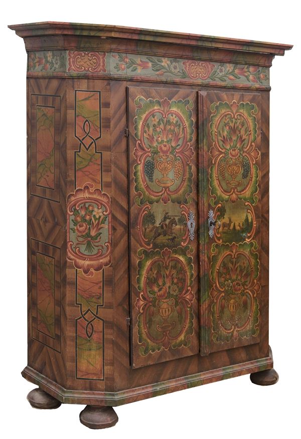 in legno dolce laccato e decorato a policromia con motivi di ghirlande, vasi con bouquet di fiori e scene di caccia centrali.