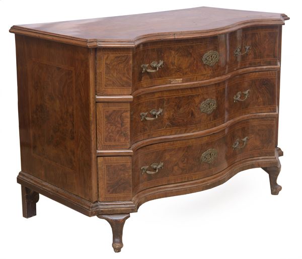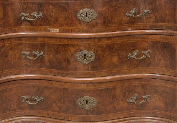 lastronato in noce e radica di noce. Fronte centinato, piano a carattere.