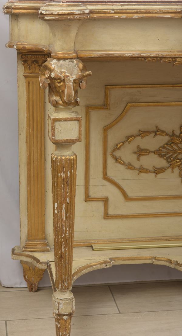 Consolle poggiante su due piedi scanalati e sormontati da teste feline. Legno laccato e dorato con piano a finto porfido rosso.