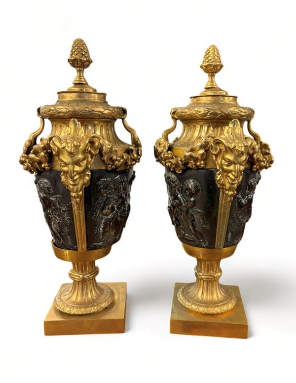 Con coperchio, in bronzo dorato e brunito, con scene di baccanale in rilievo. Manifattura francese.