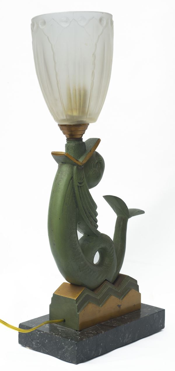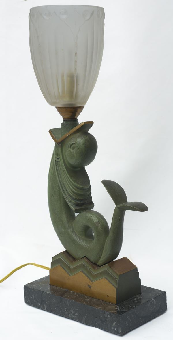 Con base in marmo. Scultura a forma di pesce in bronzo dorato e patinato verde.