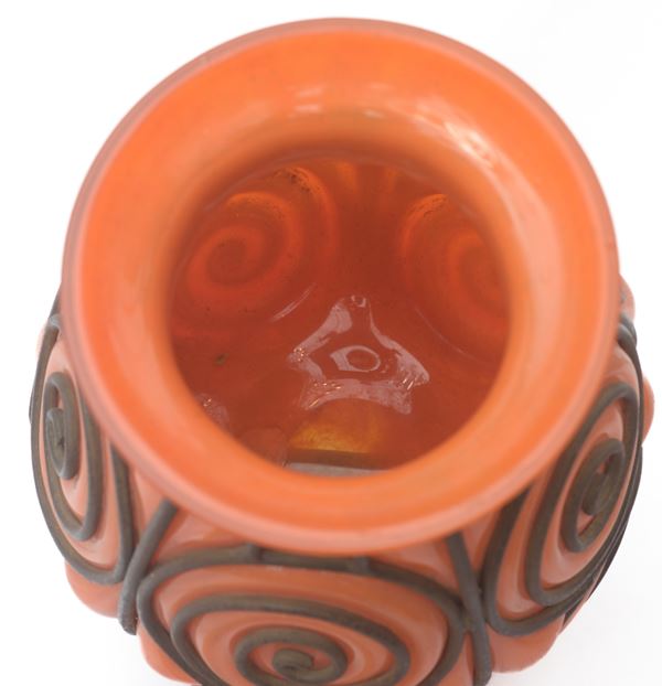 A corpo ovoidale e collo strozzato. Vetro soffiato con sfumature aranciate, entro cornice in ferro battuto con motivo a spirale e scanalature. Firma all'acido al di sotto della base: "L. Majorelle Daum Nancy France".