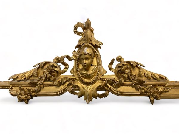 in legno dorato e intagliato. Con cimasa superiore decorata a ghirlanda di fiori. Restauri e mancanze.