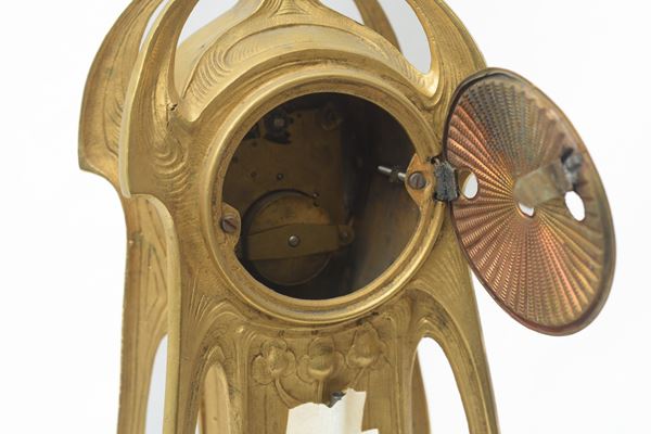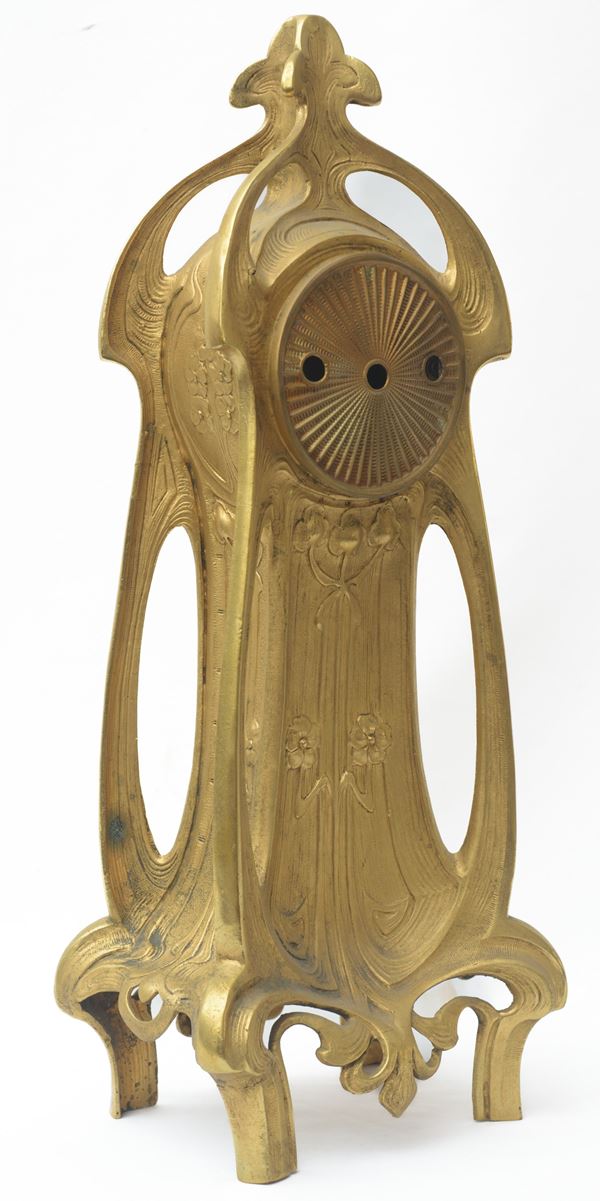 Quadrante bianco in numeri arabi, quattro anse laterali con decorazioni a rilievo a motivi floreali. Manifattura francese. Meccanica da revisionare.