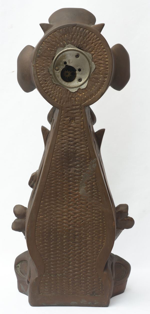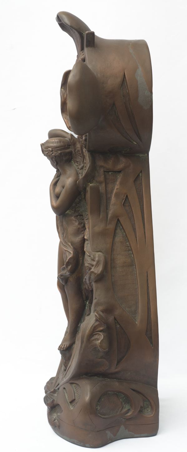 Manifattura francese. Figura femminile centrale, con quadrante bianco con numeri arabi, circondato con decorazione a petali. Meccanica da revisionare.