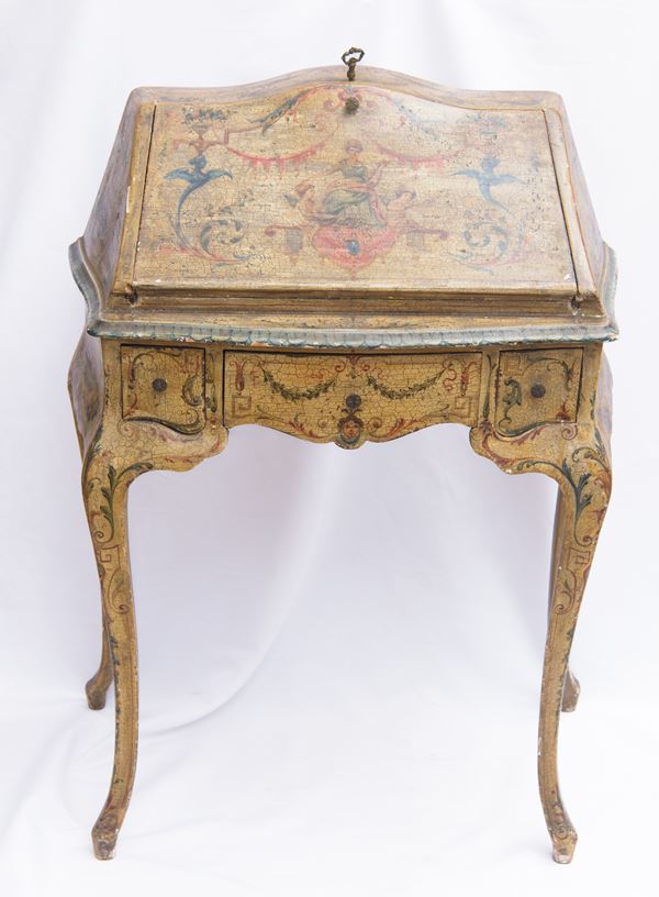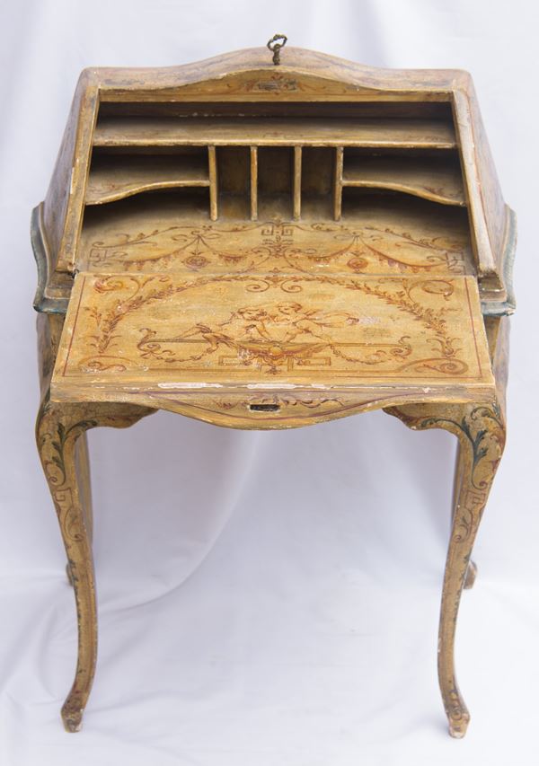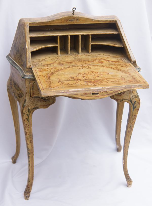 in legno laccato e decorato a ghirlande, scomparti interni a giorno e cassetti inferiori, gambe mosse. Stile Luigi XV