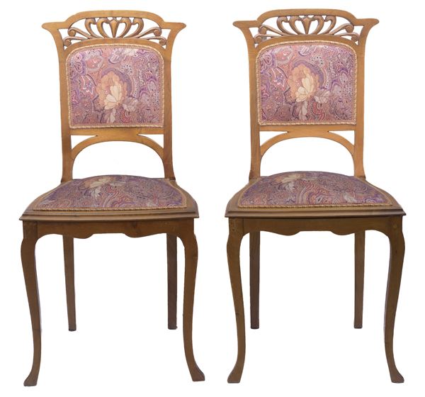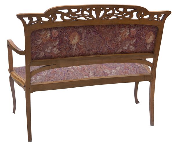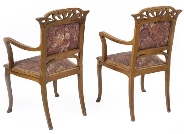 Composto da divano (101 x 50 x 120 cm), due poltroncine (97 x 60 x 50 cm) e due sedie (90 x 44 x 40 cm). Con parte superiore intagliata a motivi tipici del periodo Liberty. Seduta e schienale tappezzati. Manifattura francese.