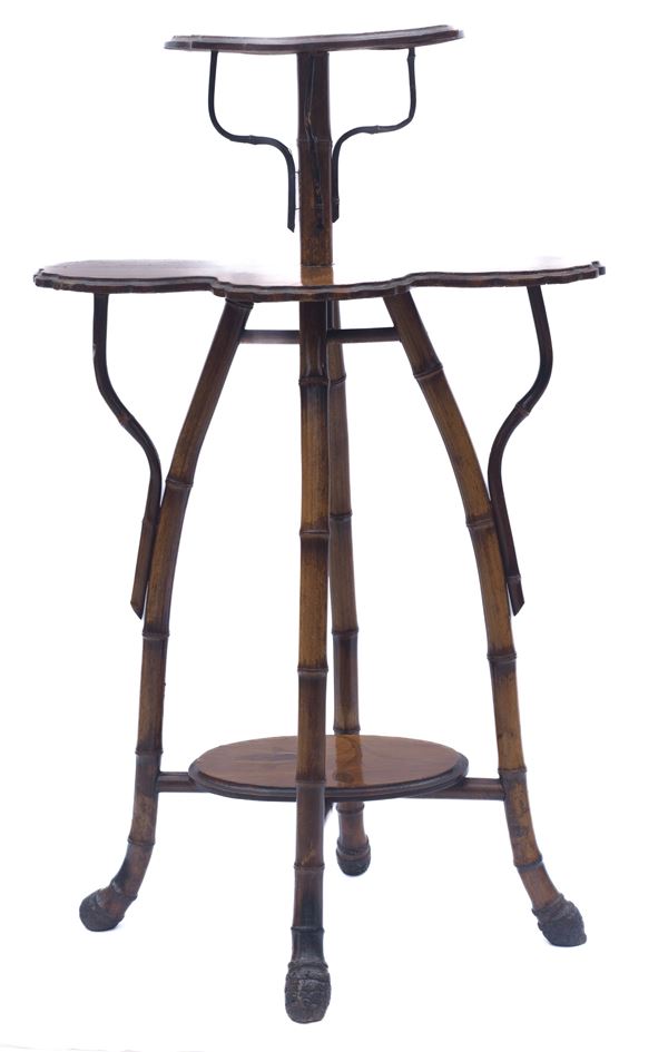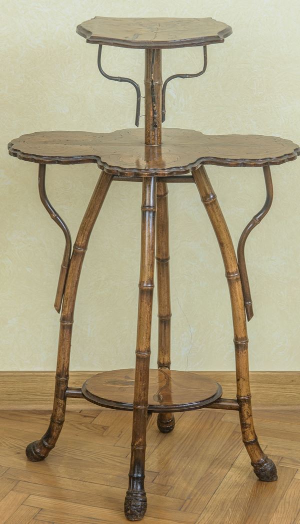 A tre ripiani, di cui quello centrale quadrilobato. Intarsi floreali con legni di varie essenze (acero, arables, palissandro, amaranto). Gambe in bambù con piede ferino. Manifattura francese.