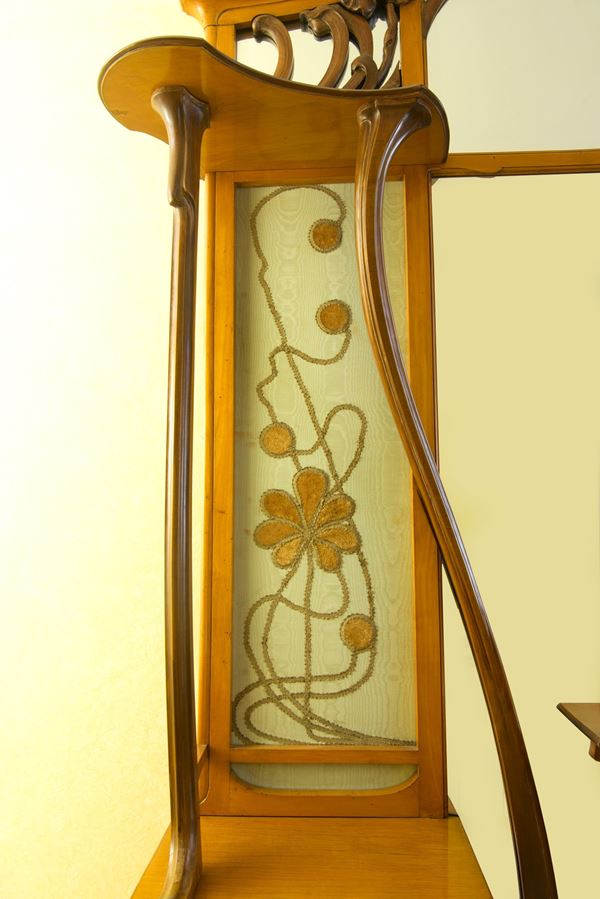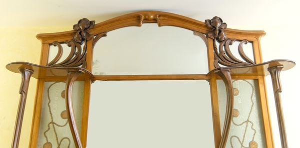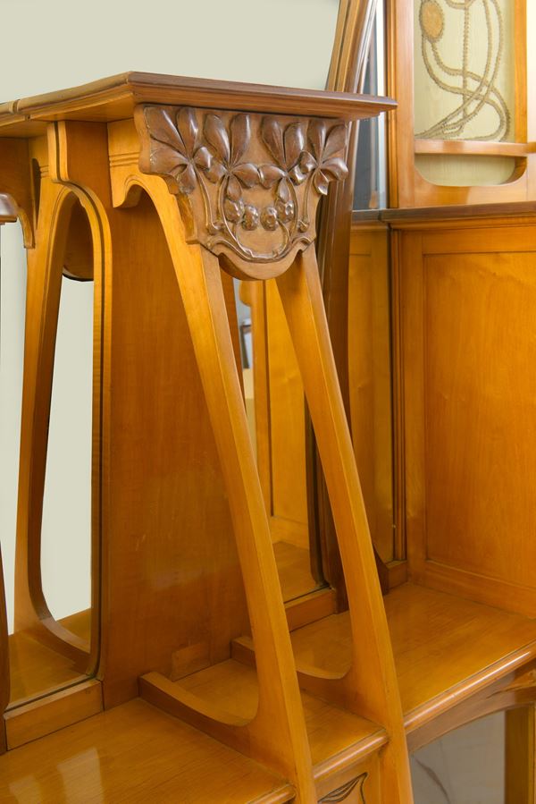 Mobile in legno d'acero, con intagli e lesene tinteggiate. Con 4 ante a vetri, basamento centrale, alzata con due ripiani laterali e specchio centrale. Riquadri laterali in tessuto ricamato.