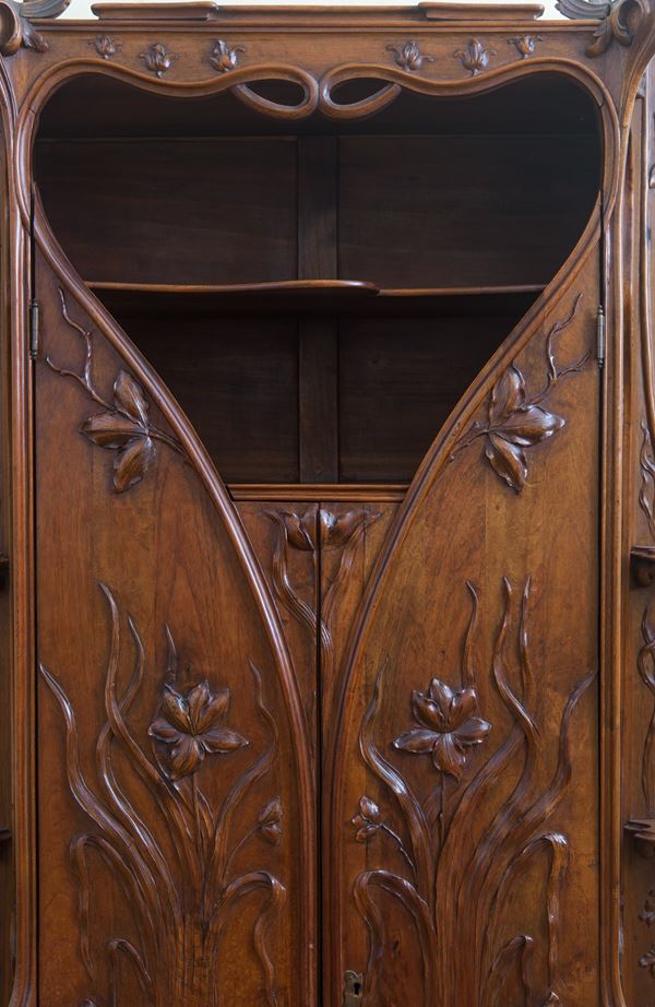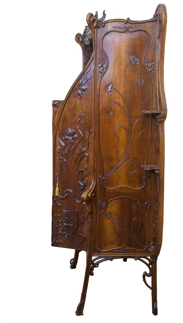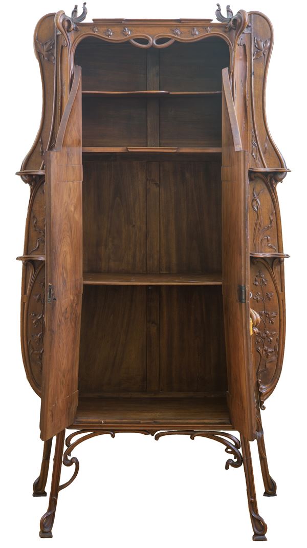 Il raro e raffinato mobile a doppia anta con due ripiani laterali per lato e apertura a giorno centrale presenta i caratteri propri dell'eclettico artista francese Eugène Vallin, architetto e ebanista della Scuola di Nancy. Il mobile si caratterizza da preziosi intagli in rilievo, tecnica nella quale Vallin fu maestro.