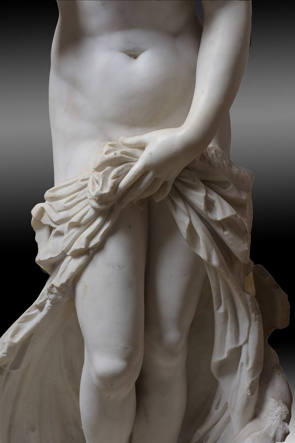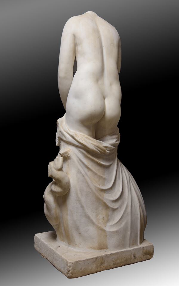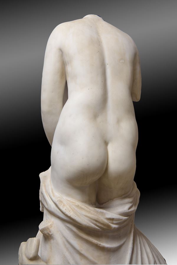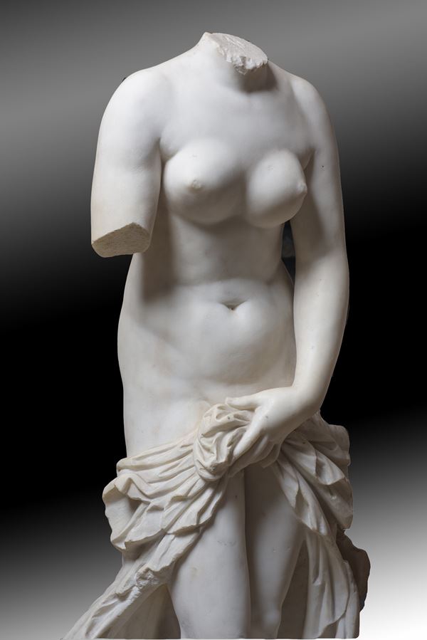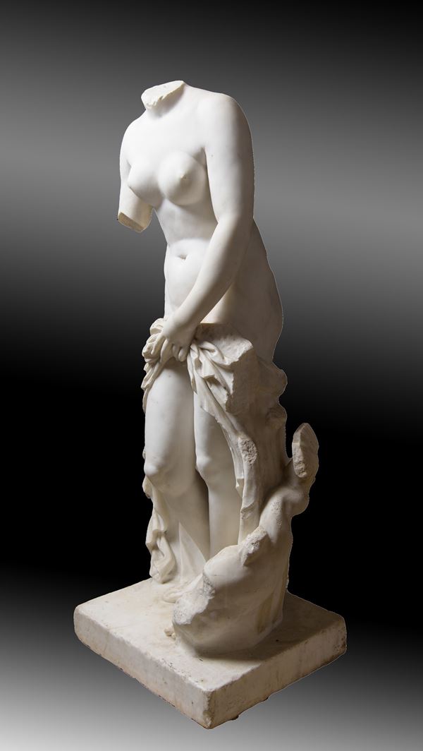 scultura in marmo bianco statuario. Replica della scultura marmorea acefala conservata presso il museo archeologico di Siracusa, già copia romana di un originale greco della prima metà del II sec. d.c., rinvenuta negli Orti Bonavia da Saverio Landolina Nava nel 1804. Reca al retro della base iscrizione " Simonetti Roma MCMX", pittore e antiquario attivo tra la fine del XIX e inizio XX secolo. Dal 1904 Palazzo Odescalchi Simonetti in Prati divenne la sede della sua galleria di antiquariato e atelier di pittore. Tra i suoi clienti annoverò Lord William Waldorf Astor, di cui curò, con il figlio Aldo, il progetto e arredamento della cosidetta villa pompeiana a Sorrento, dalla cui proviene la suddetta scultura.