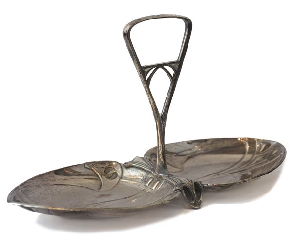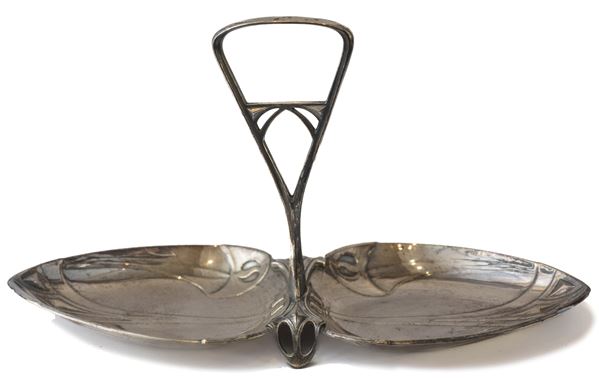 Modellato come due coppe decorato da motivi floreali e decorazioni a sbalzo. Con punzoni WMF (Württembergische Metallwarenfabrik).