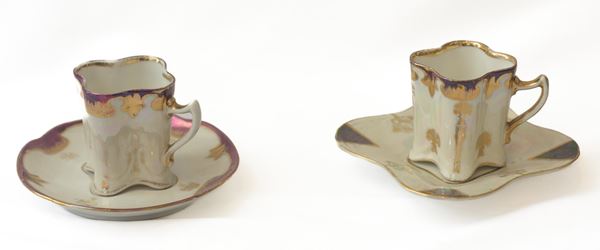 Vassoio con punzoni WMF (Württembergische Metallwarenfabrik); coppia di tazze da caffè con marchio retro della base  Ginori in verde.